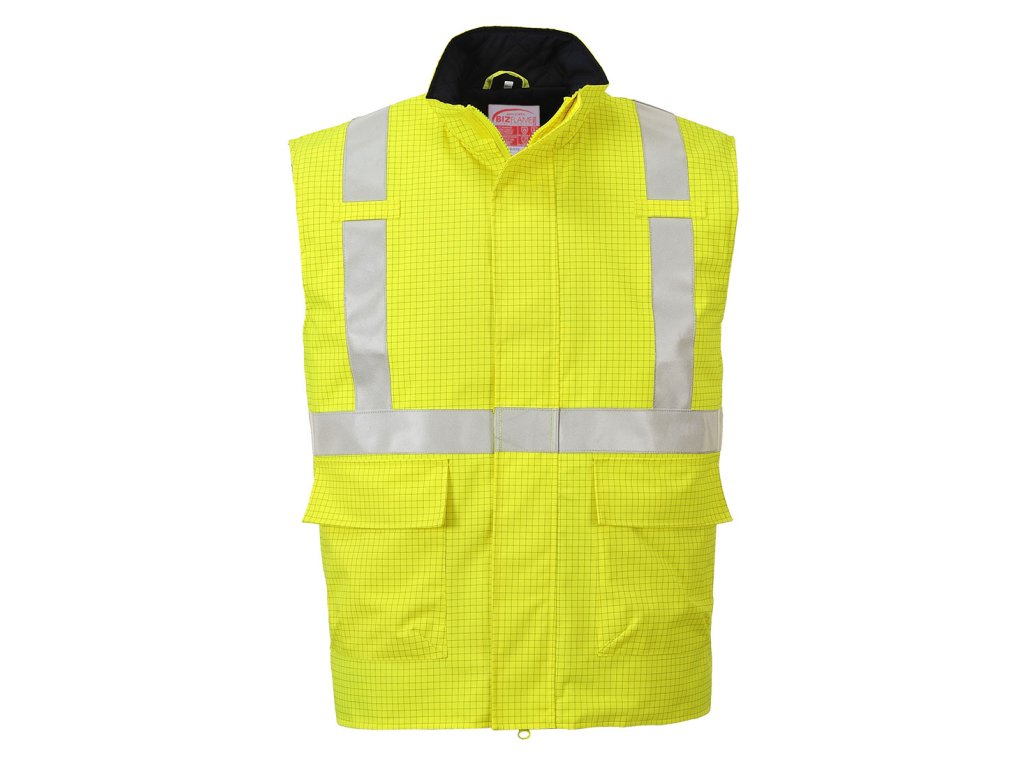 Tato multifunkční vesta s vysokou viditelností, odolná proti plamenům a chemikáliím a antistatickými vlastnostmi, je skvělým doplňkem k vestě Bizflame Rain HV, obsahuje skrytou kapsu na mobilní telefon pod klopou proti bouři pro snadný přístup a prošívanou nehořlavou podšívku pro maximální ochranu a pohodlí.