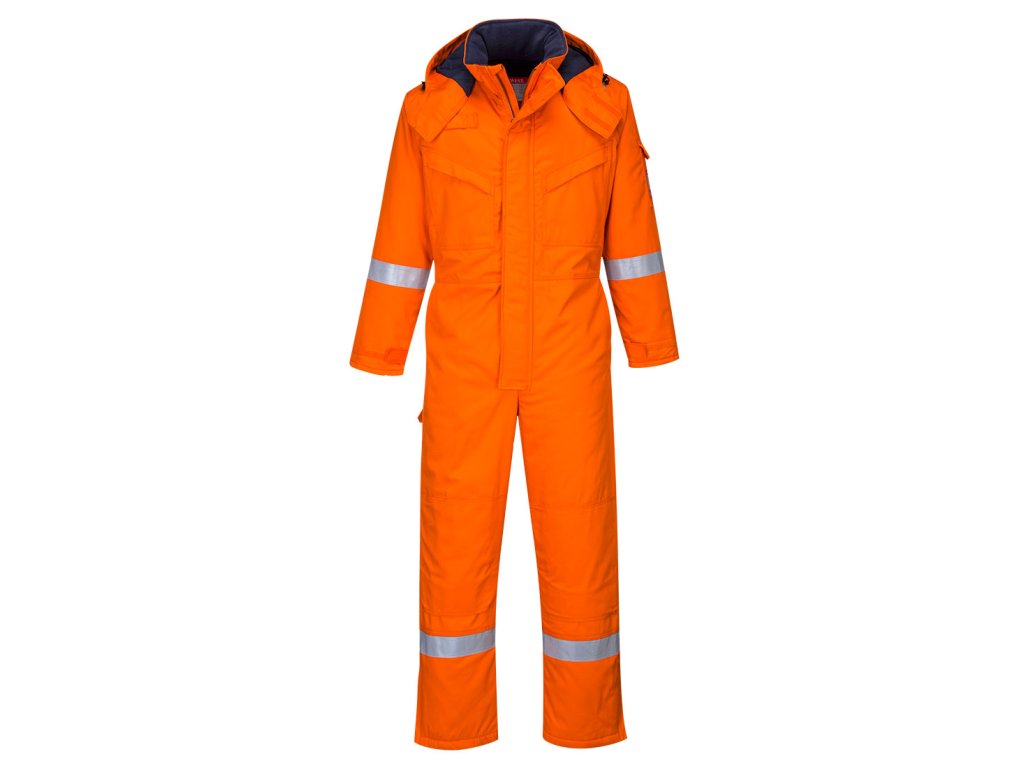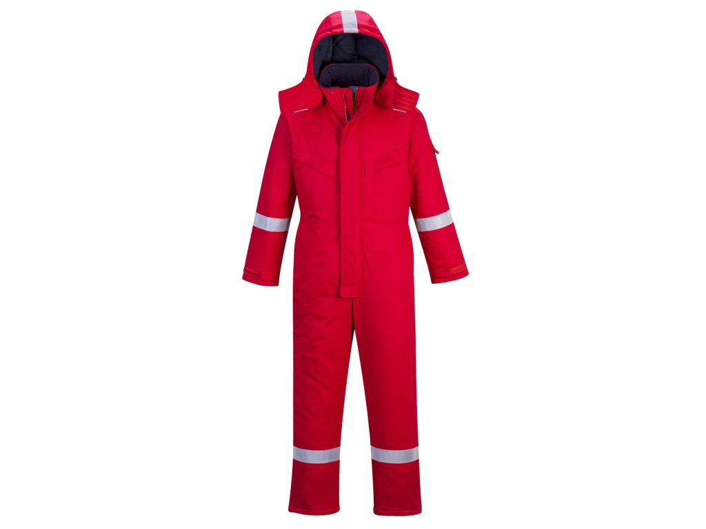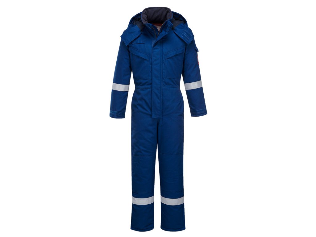 Zimní FR kombinéza vznikla na základě požadavků průmyslového odvětví. Nehořlavá a navíc zateplená kombinéza splňuje náročné požadavky na pracovní podmínky. Reflexní pásky, dvojité švy, splnění všech požadovaných norem EN, krytý dvoucestný přední zip, dvě přední náprsní kapsy s krytým zipem z mosazi. Tento oděv má také patentované kapsy na kolenní vložky s inovativním dvoustupňovým systémem a odepínací kapuci na zip.