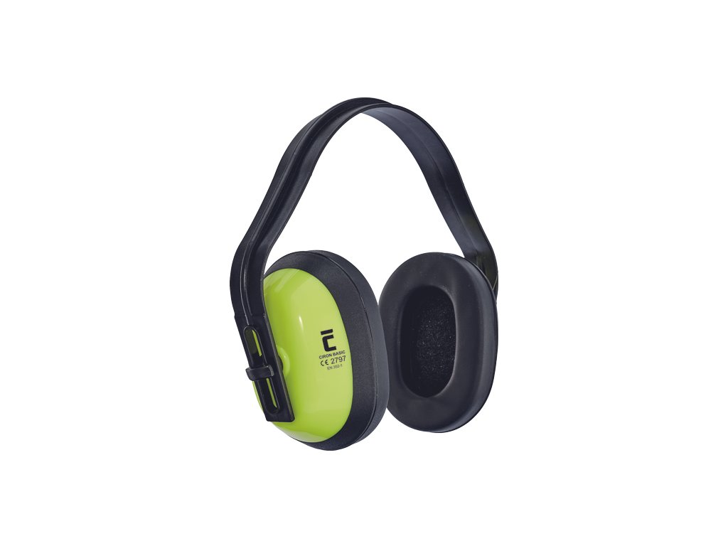 dielektrické mušlové chrániče sluchu s plastovým hlavovým obloukem; díky vysoce viditelné barvě jsou vhodné zejména pro použití v exteriéru