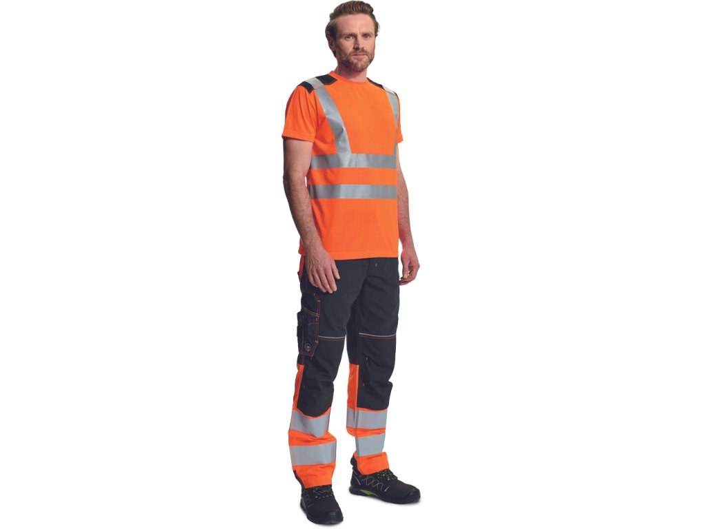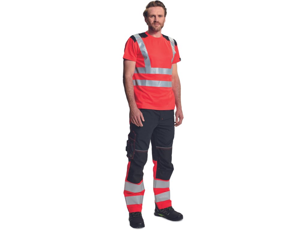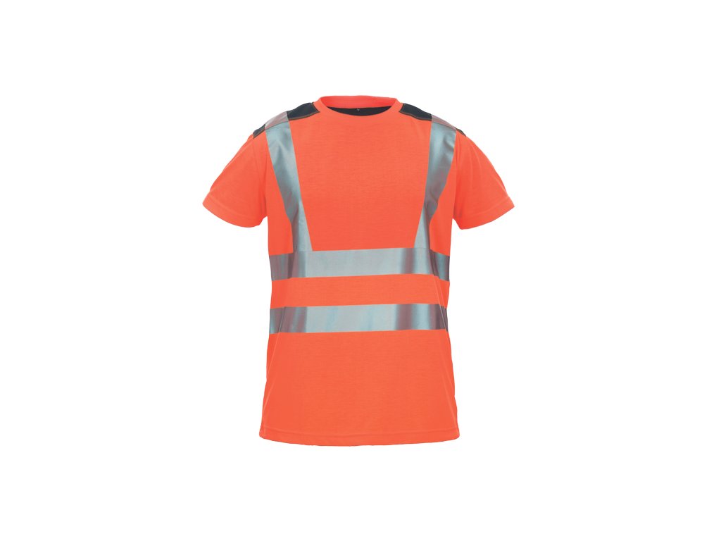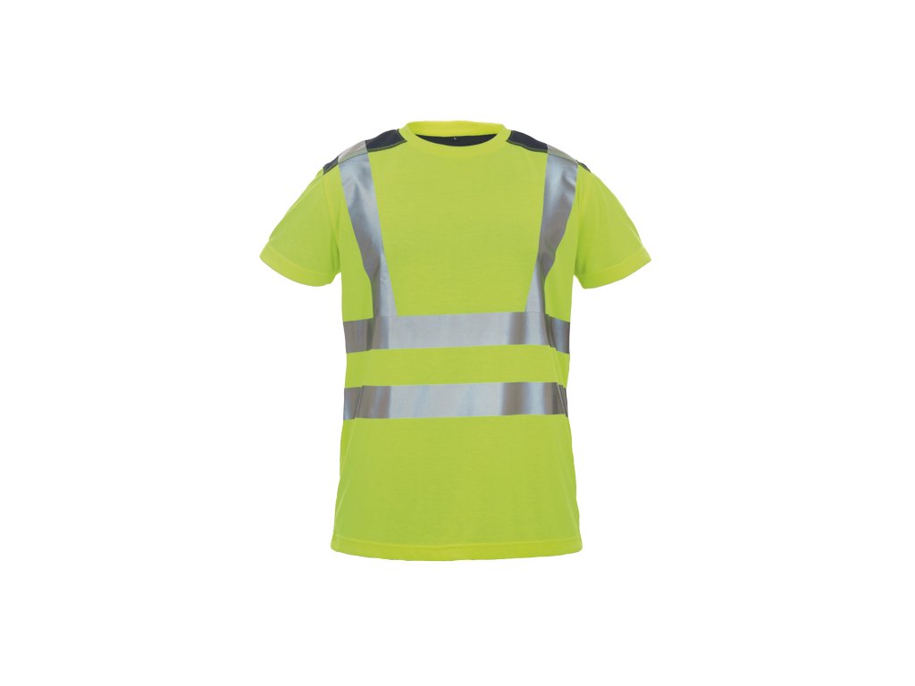 • HI-VIS tričko z lehkého polyesterového úpletu • sedlo v kontrastní černé barvě lemované reflexní paspulkou • tištěné 5 cm reflexní pruhy • dekorativní prošití