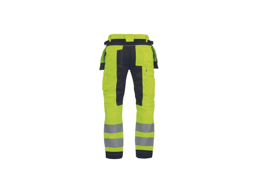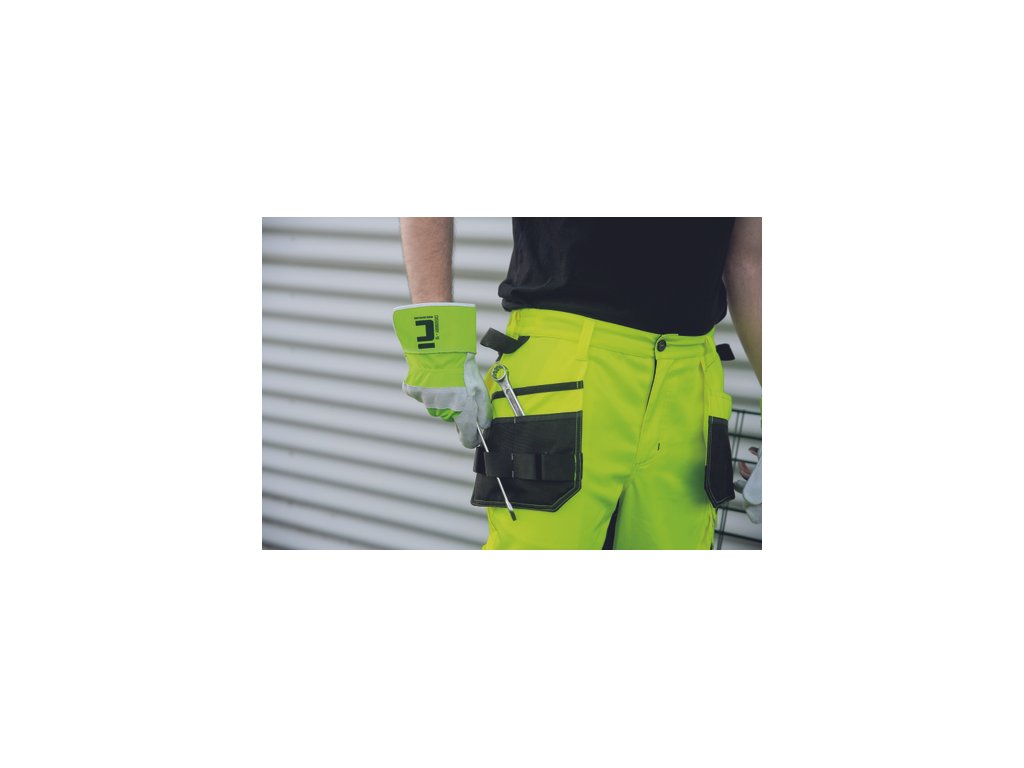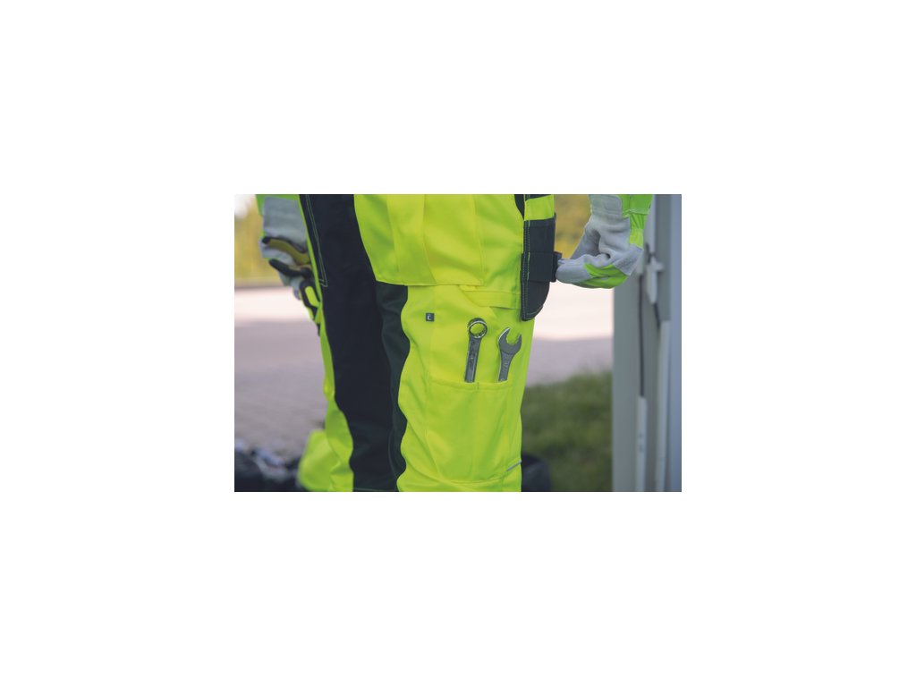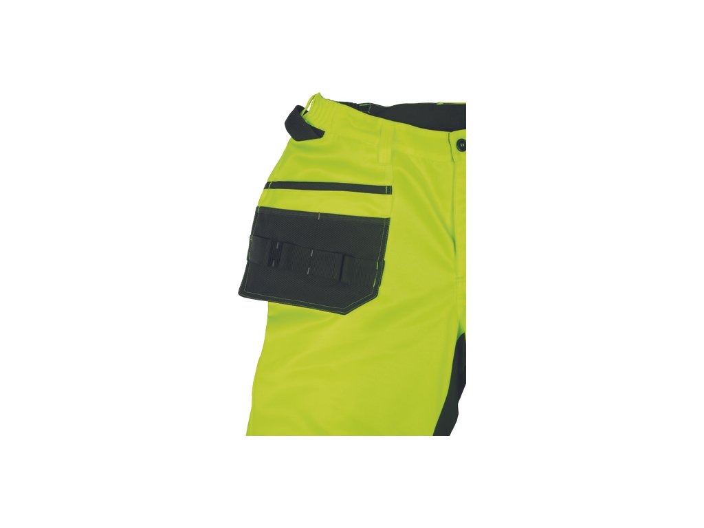 • pánské pracovní HI-VIS kalhoty s elastickým pasem • 2 multifunkční létací kapsy • 2 tištěné 7,5 cm široké reflexní pruhy na spodních nohavicích • zesílení kolenních částí Oxford 600D s možností vložení chráničů kolen • možnost prodloužení délky nohavic