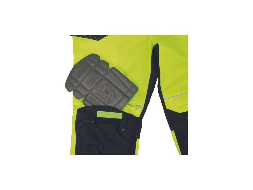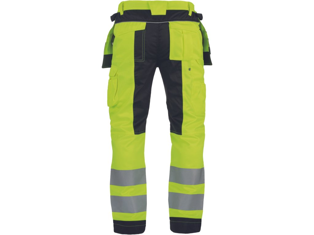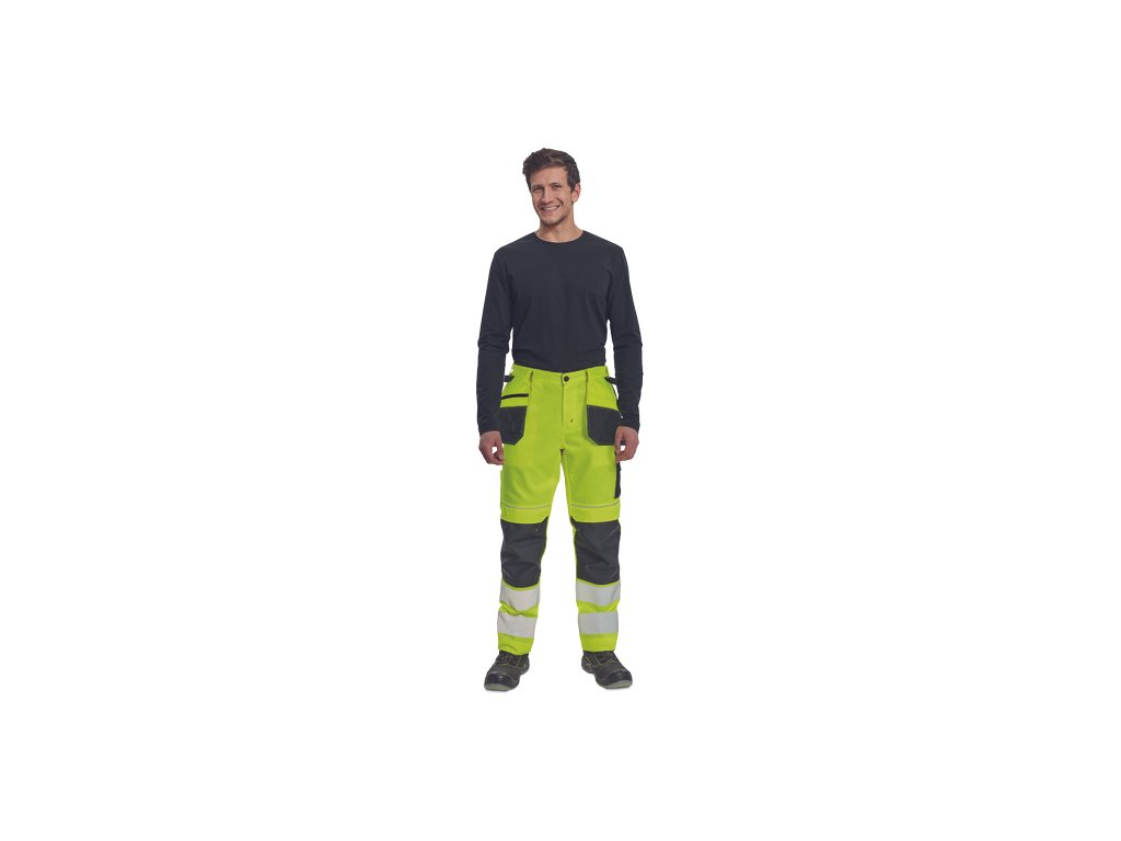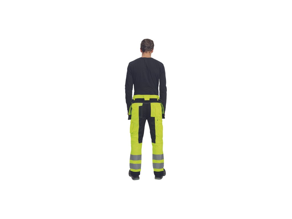 • pánské pracovní HI-VIS kalhoty s elastickým pasem • 2 multifunkční létací kapsy • 2 tištěné 7,5 cm široké reflexní pruhy na spodních nohavicích • zesílení kolenních částí Oxford 600D s možností vložení chráničů kolen • možnost prodloužení délky nohavic