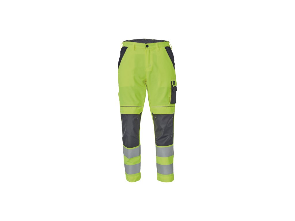 • pánské HI-VIS pracovní kalhoty s elastickým pasem • 2 přední kapsy • 1 levá zdvojená stehenní kapsa • 2 zadní kapsy • 2 menší zadní kapsičky na pravém stehnu • dvojice tištěných 7.5 cm reflexních pruhů na spodní části nohavic, reflexní paspulky • Oxford 600D zesílení kolen s možností horního vkládání nákoleníků • možnost prodloužení nohavic