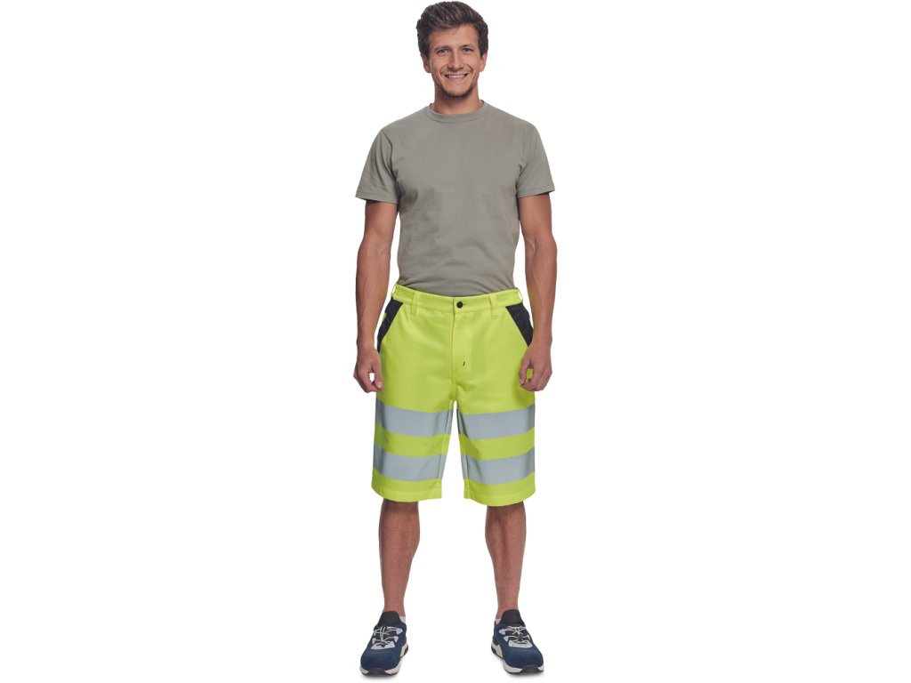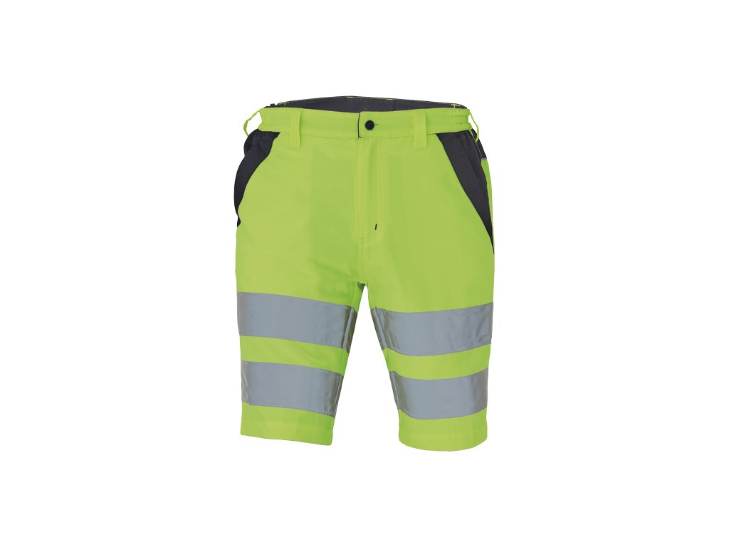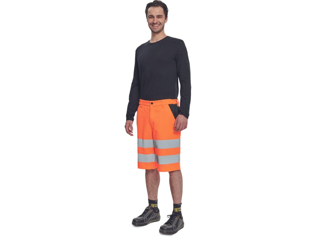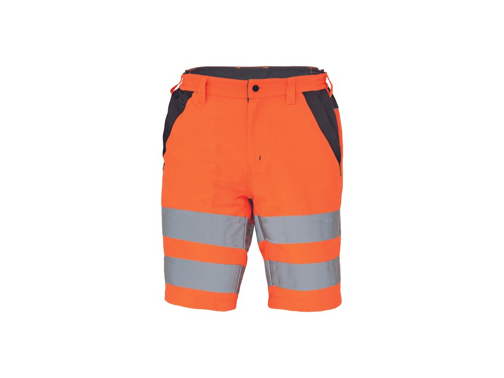 • pánské HI-VIS pracovní šortky s elastickým pasem • 2 přední kapsy, 2 zadní kapsy • dvojice tištěných 7 cm reflexních pruhů po obvodu stehen • reflexní paspulky