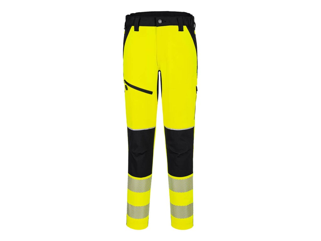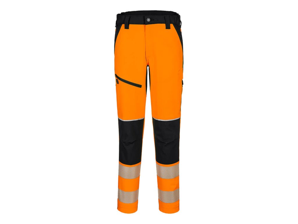 Tyto lehké strečové kalhoty s vysokou viditelností jsou vyrobeny z vysoce výkonné čtyřsměrné strečové tkaniny, která zajišťuje maximální rozsah pohybu při práci. Jsou vybaveny pružným segmentovým reflexním páskem HiVisTex Pro, diagonální kapsou na zip, zesílenými koleny, kontrastním sedacím panelem a částečně elastickým pasem pro větší pohodlí.