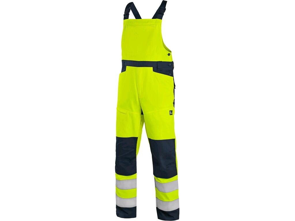 Pánské výstražné kalhoty s náprsenkou, letní, šle s gumou vzadu, náprsní kapsa na zip, boční zapínání na knoflíky, kryté přední zapínání na zip, 2 přední kapsy, 2 zadní kapsy s klopou na suchý zip, pravá boční kapsa na zip, zdvojená kolena s možností