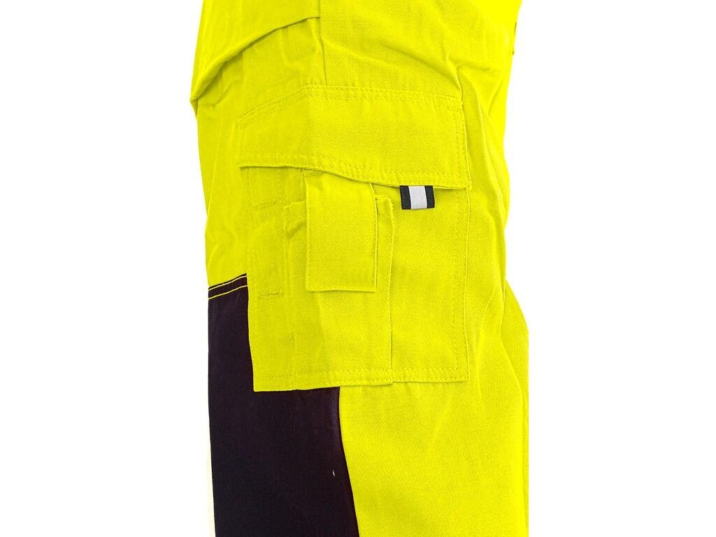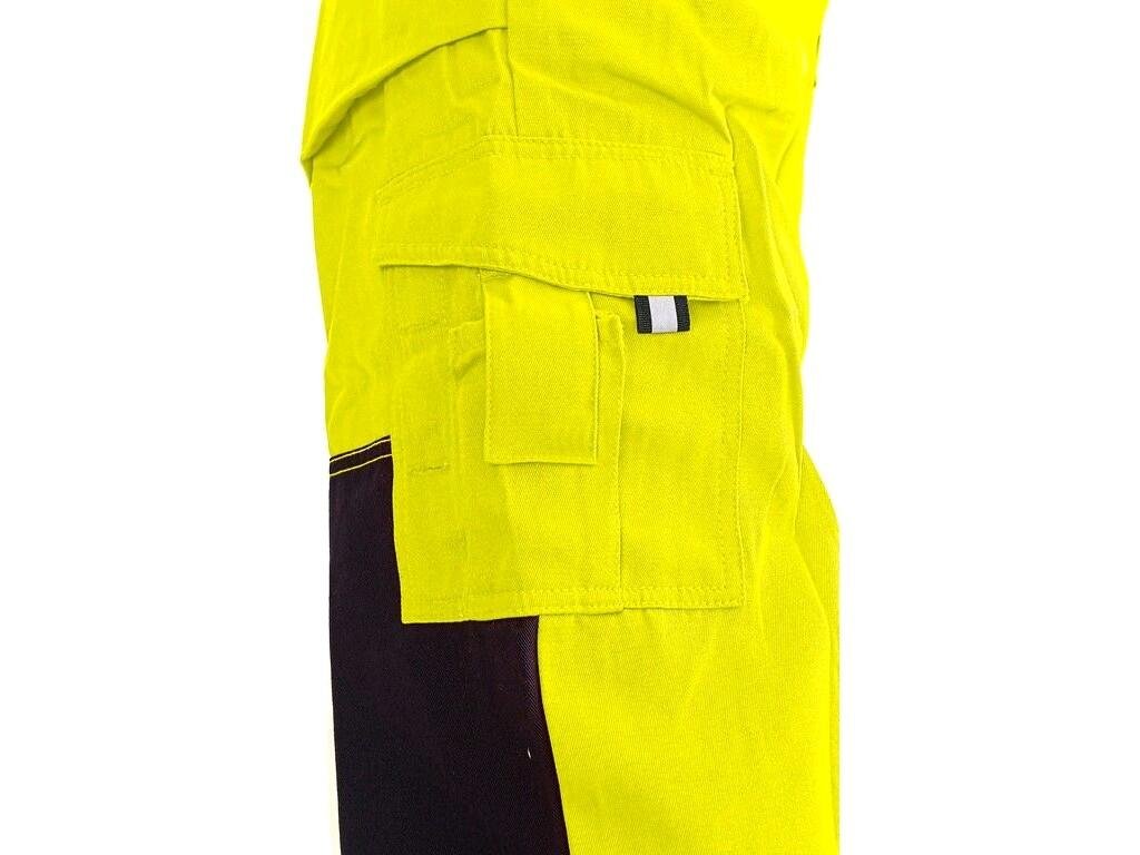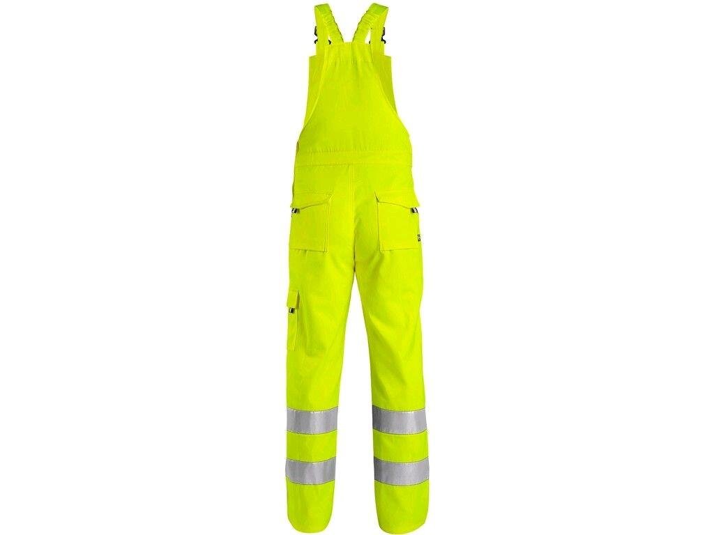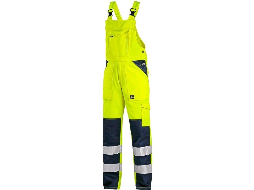 Pánské výstražné kalhoty s náprsenkou, šle s gumou vzadu, náprsní kapsa na suchý zip s menší kapsou na tužku, 2 přední kapsy, 2 zadní kapsy s patkou na suchý zip, kryté přední zapínání na zip, boční zapínání na knoflíky, levá boční kapsa s menší kapsou na tužku, 3M reflexní pásky (šíře 7 cm). Doporučené použití: stavebnictví, silničáři, řidiči, údržba, logistika, letecká a lodní doprava, popeláři, záchranáři.